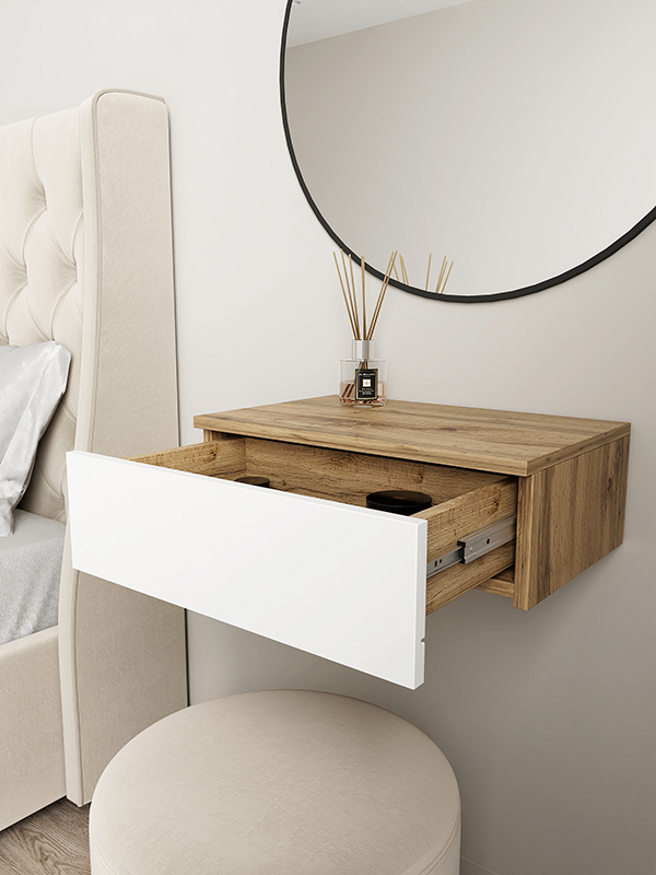 Модель выполнена в современном двухцветном дизайне — Дуб Вотан и Белый, что позволяет ей стать стильным акцентом в интерьере. Встроенный выдвижной ящик с безопасной системой открывания за нижний край защищает от случайного выпадения содержимого и удобен в использовании. Консоль крепится напрямую к стене, создавая ощущение лёгкости и не загромождая пол.