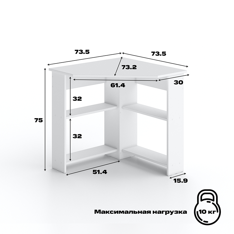 - Эргономичная угловая форма: Габариты 735x735x750 мм оптимально используют угол комнаты, экономя пространство и предоставляя просторную поверхность для работы.