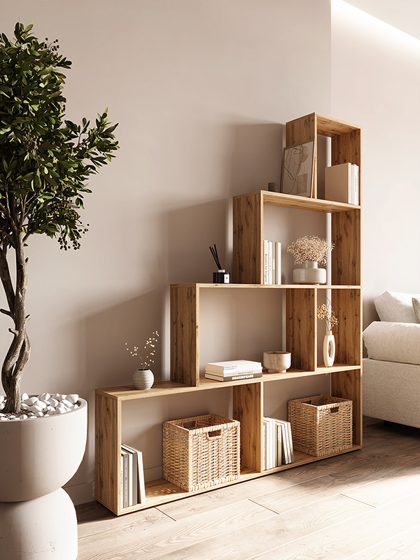 Открытые полки предоставляют неограниченные возможности для хранения и демонстрации: от обширной библиотеки и коллекций до комнатных растений, декора, игрушек или системных блоков. Стеллаж можно использовать как элегантную перегородку, которая не «крадет» свет и создает ощущение открытости, одновременно предоставляя множество полезных площадей.