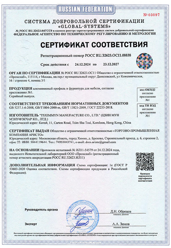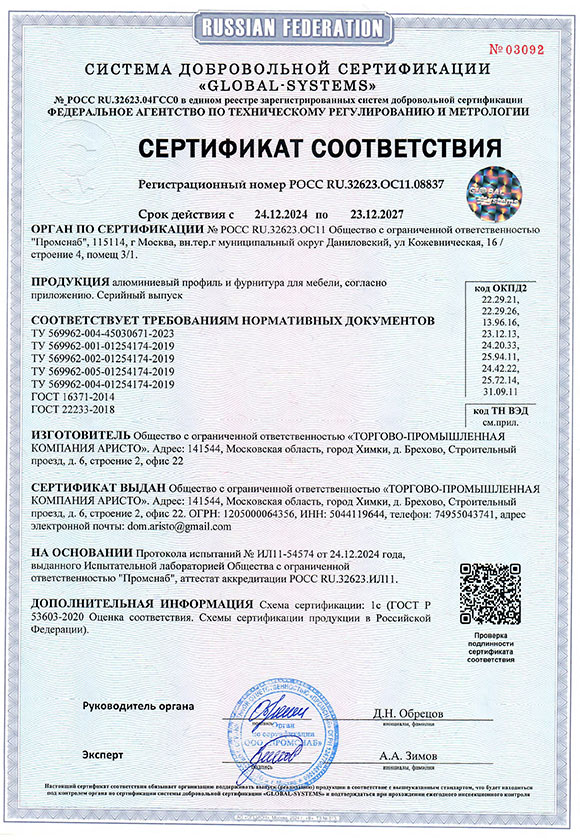 Сертификат соответствия ARISTO. Алюминиевый профиль и фурнитура для мебели