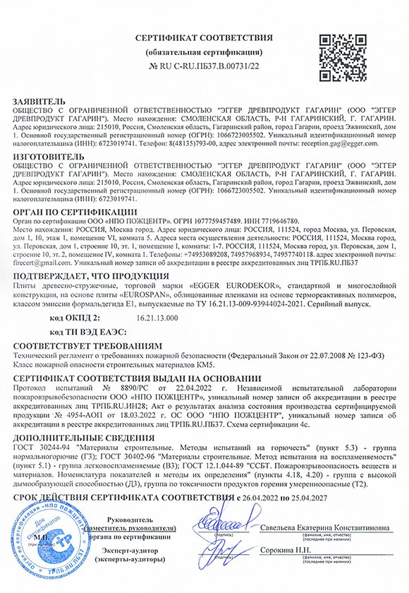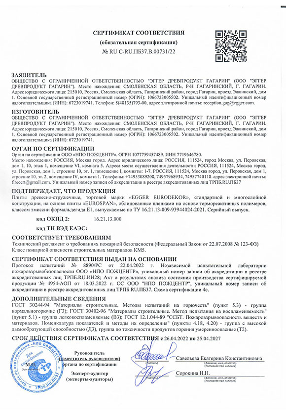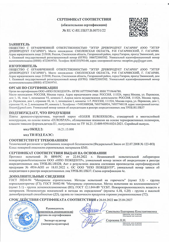Сертификат соответствия пожарной безопасности Egger Eurodekor