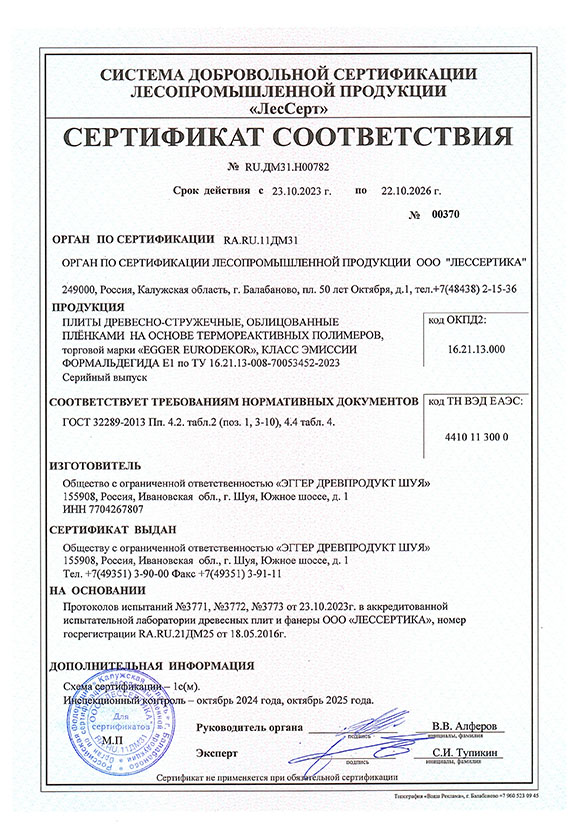 Сертификат соответствия EGGER. ЛДСП Eurodekor