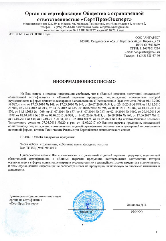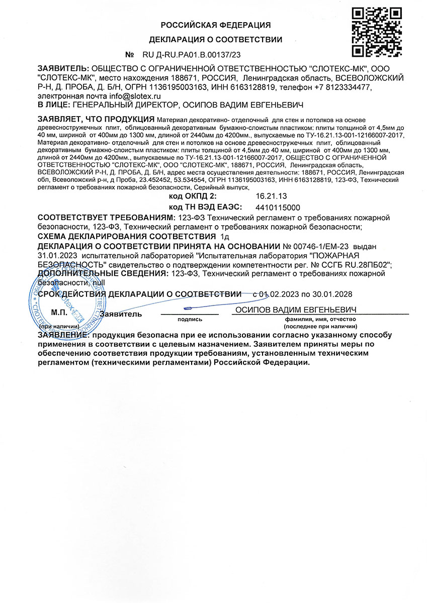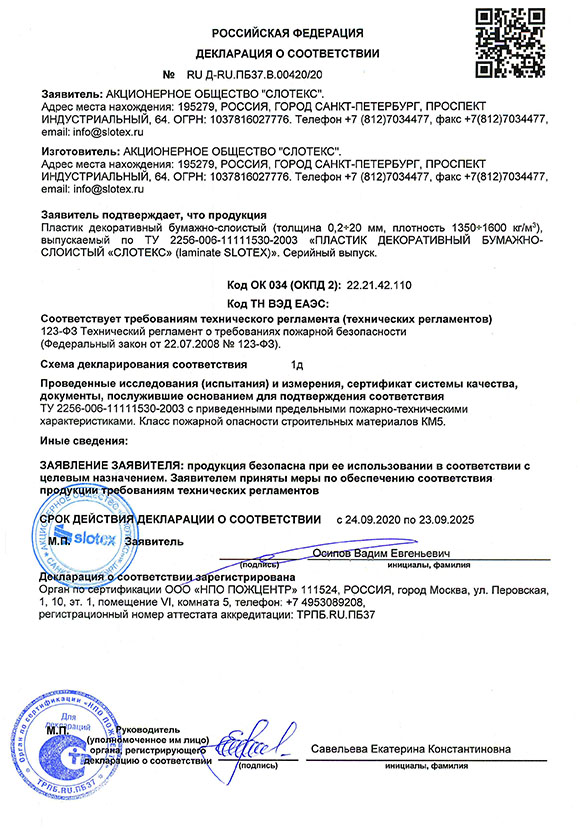 Декларация о соответствии покрытия столешниц и стеновых панелей Slotex требованиям пожарной безопасности 2020-2025