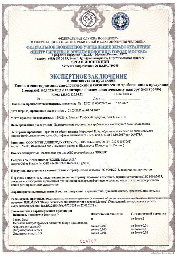 Экспертное заключение о соответствии Пластиковой кромки АБС Egger. Стр. 1