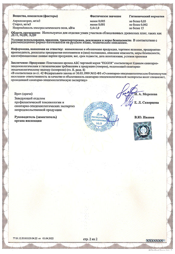 Экспертное заключение о соответствии Пластиковой кромки АБС Egger. Стр. 2