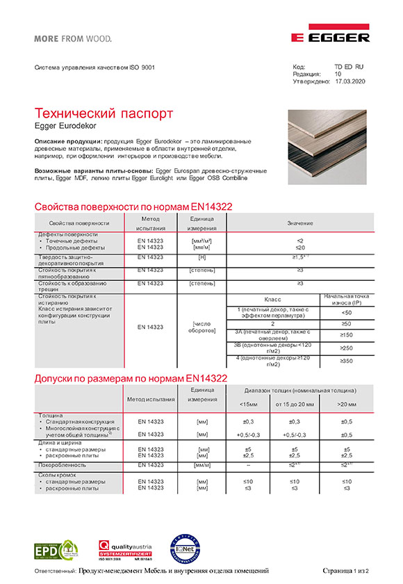 Технический паспорт ЛДСП Egger Eurodekor. Стр. 1