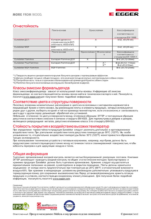 Технический паспорт ЛДСП Egger Eurodekor. Стр. 2