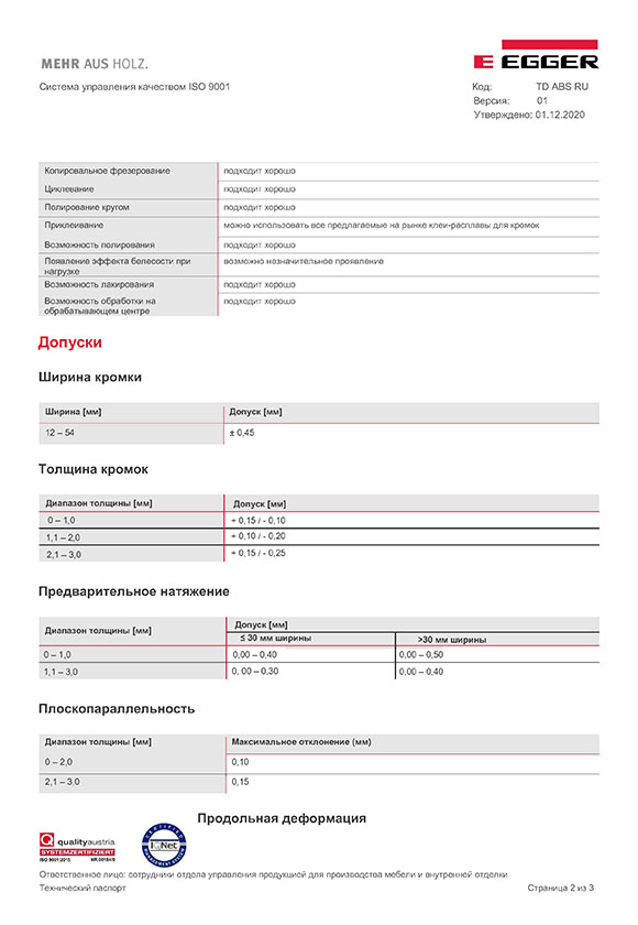 Технический паспорт Пластиковая кромка AБС EGGER. Стр. 2