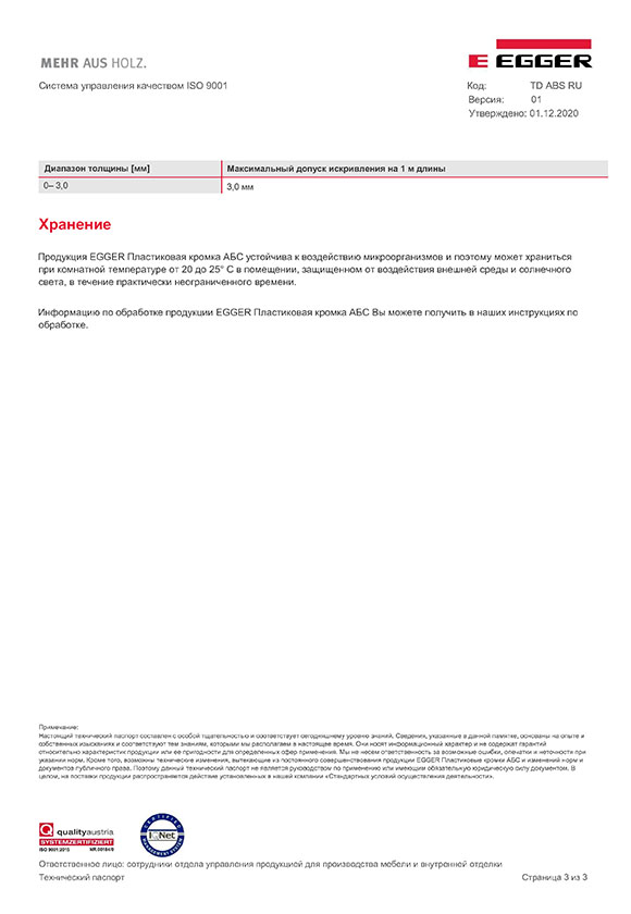 Технический паспорт Пластиковая кромка AБС EGGER. Стр. 3