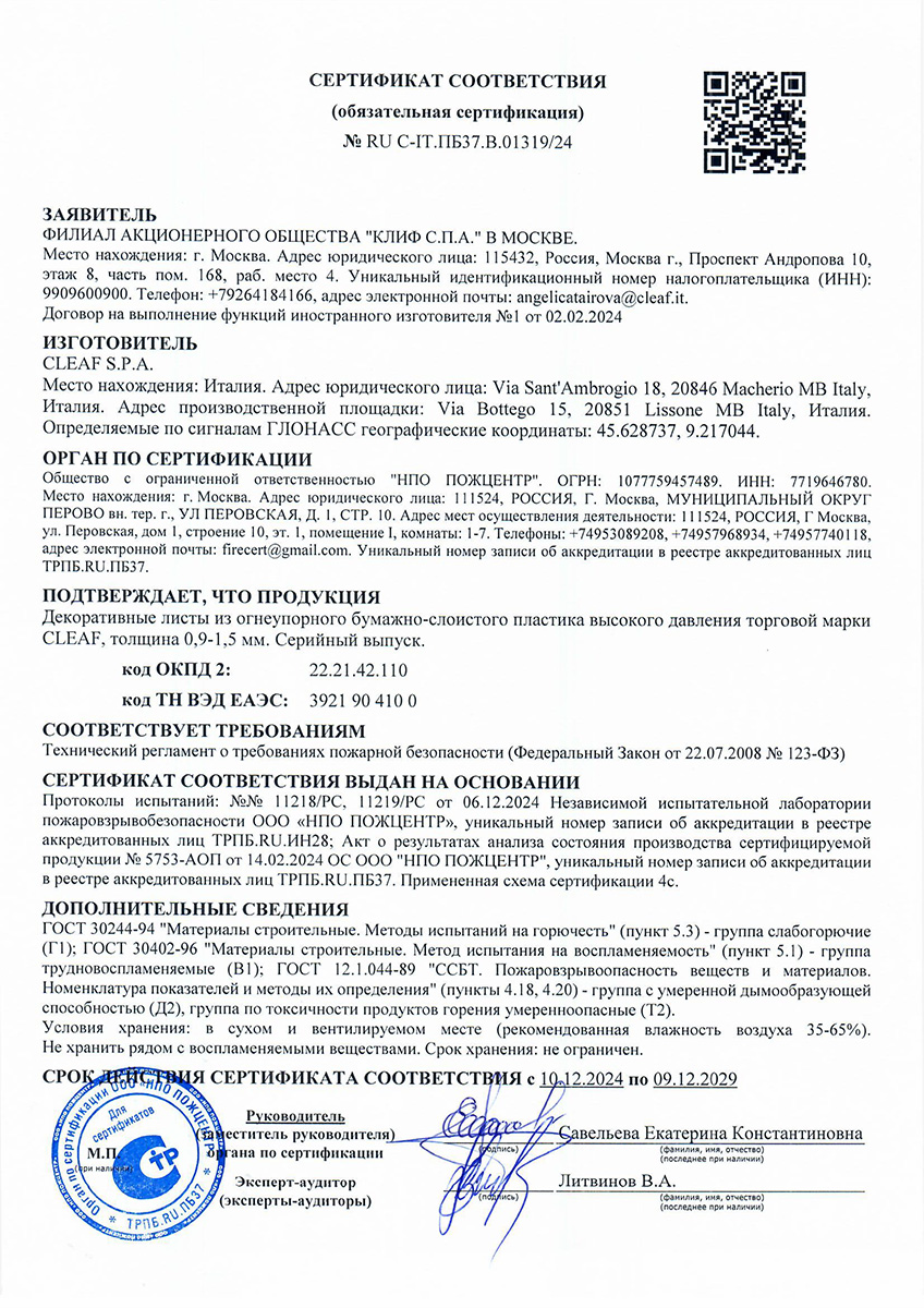 TSS Cleaf, cертификат соответствия требованиям пожарной безопасности