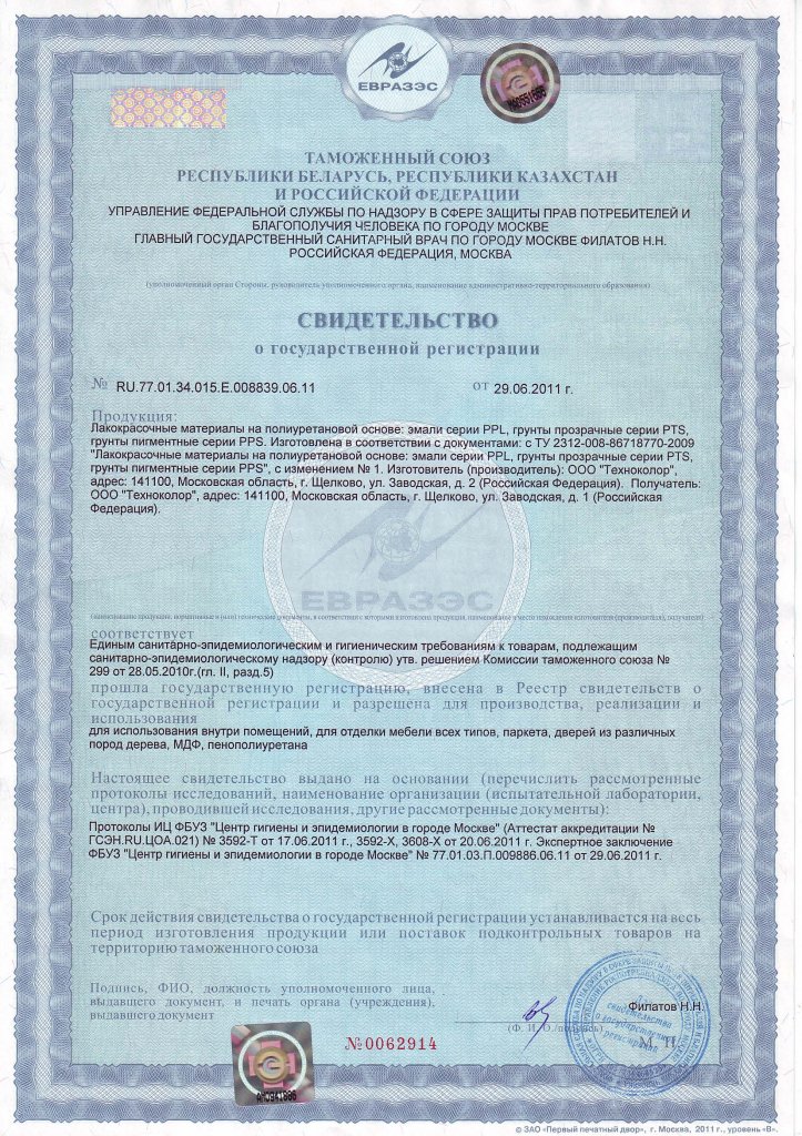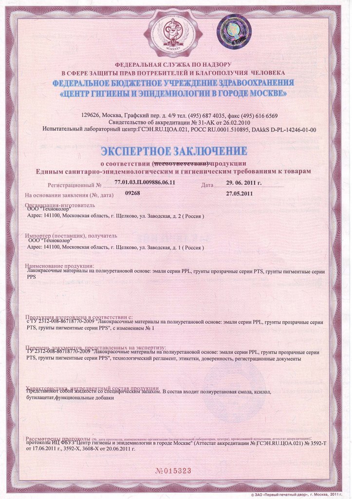 Свидетельство о гос. регистрации ЛКМ серии PPL ООО "Техноколор"