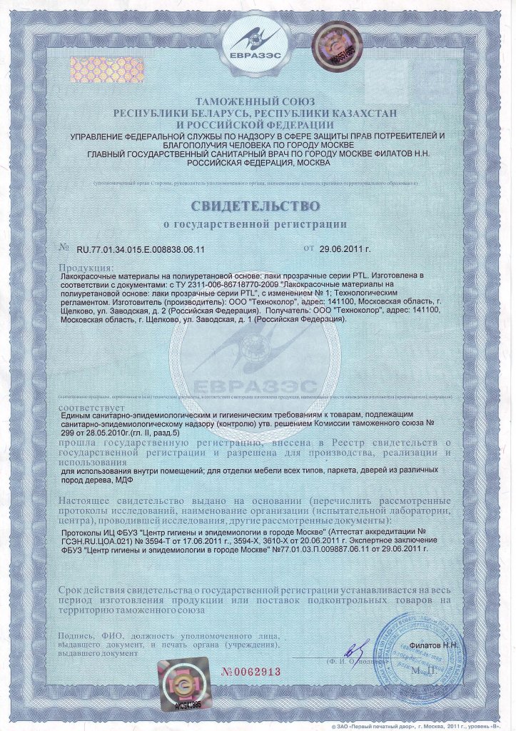 Свидетельство о гос. регистрации ЛКМ серии PTL ООО "Техноколор"