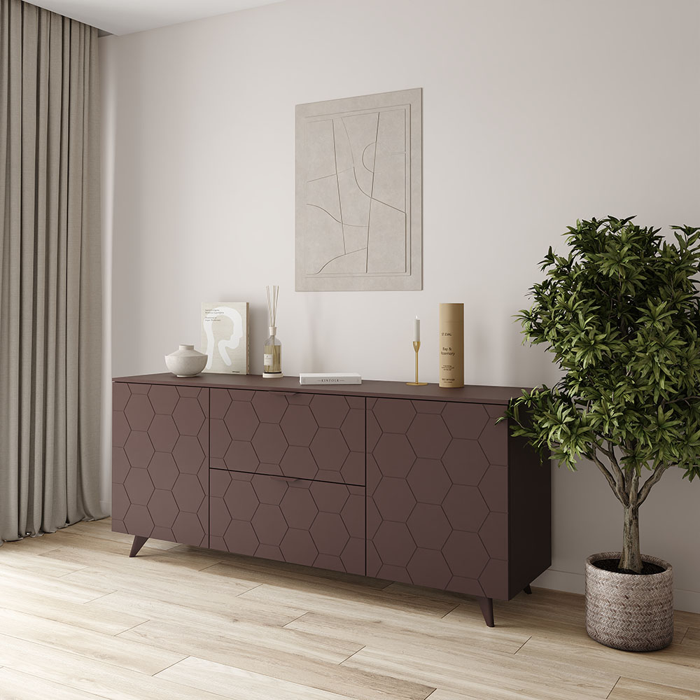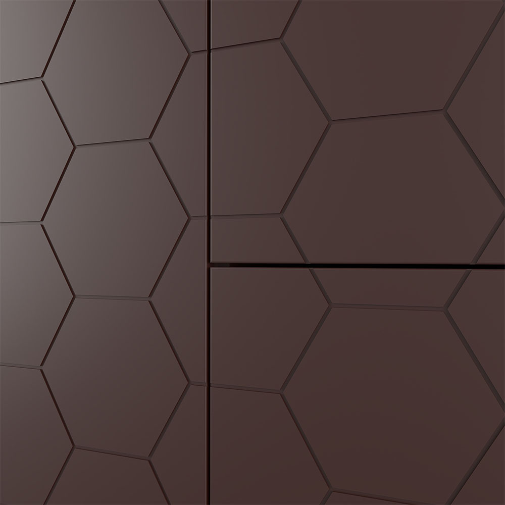 Смелая фрезеровка на фасадах в виде многоугольников, имитирующих пчелиные соты, привнесет в интерьер оригинальность. Такая мебель станет основным акцентом пространства, в котором находится.