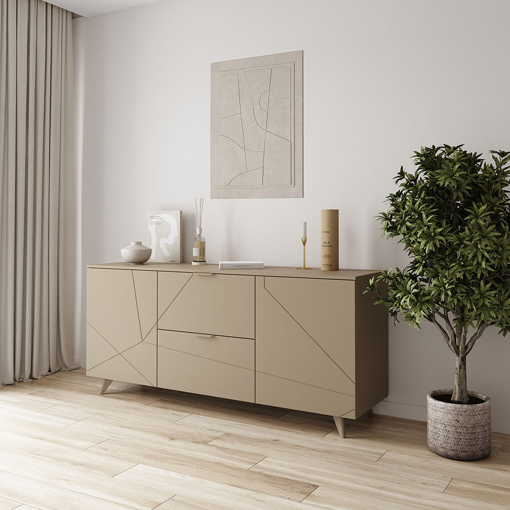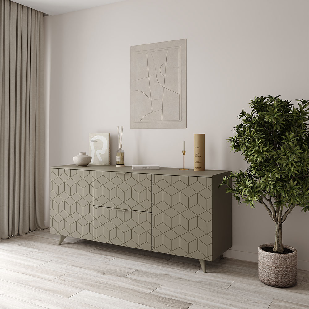 Фактурная фрезеровка с геометрическими фигурами дает ощущение необычного контраста по сравнению с привычными гладкими фасадами. Такая мебель становится выразительной и интересной.