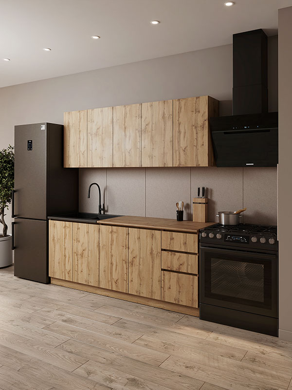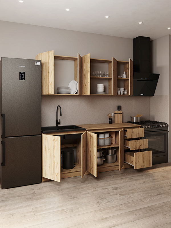 Стеновая панель, мойка, сантехника в комплект не входят. Тумба под мойку предусмотрена без столешницы, рекомендуем выбирать накладные мойки размером 800 х 600 мм. Высота нижних модулей указана без учета высоты столешницы. Максимальная нагрузка на полки 10 кг. Максимальная нагрузка на ящики 10 кг.