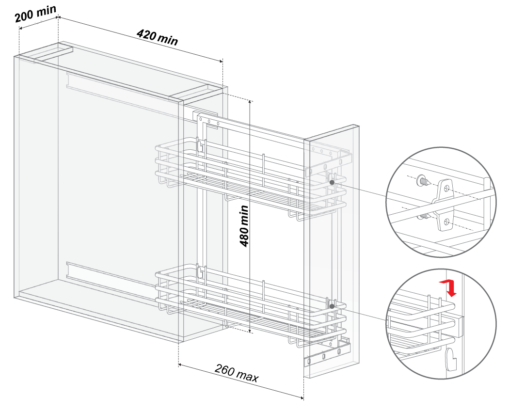 Выдвижная корзина для кухни KR03/1/1/200, без доводчика