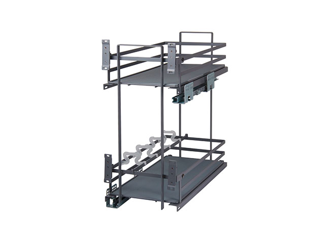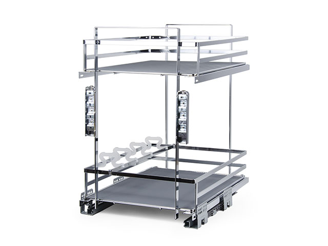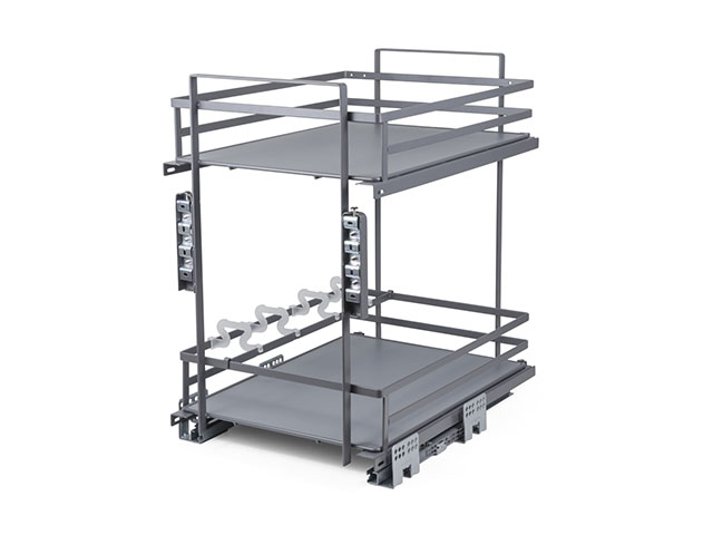 Выдвижная двухуровневая корзина QUADRA – стильное решение для эффективного хранения бытовой или кухонной утвари в модулях шириной 300 и 400 мм. Оба этажа обладают сплошным дном с антискользящим покрытием стильного графитового цвета. Дно можно легко снять для чистки и мойки. В нижнем ярусе модели предусмотрены дополнительные съемные делители для устойчивого хранения небольших емкостей или пакетов с сыпучими продуктами.