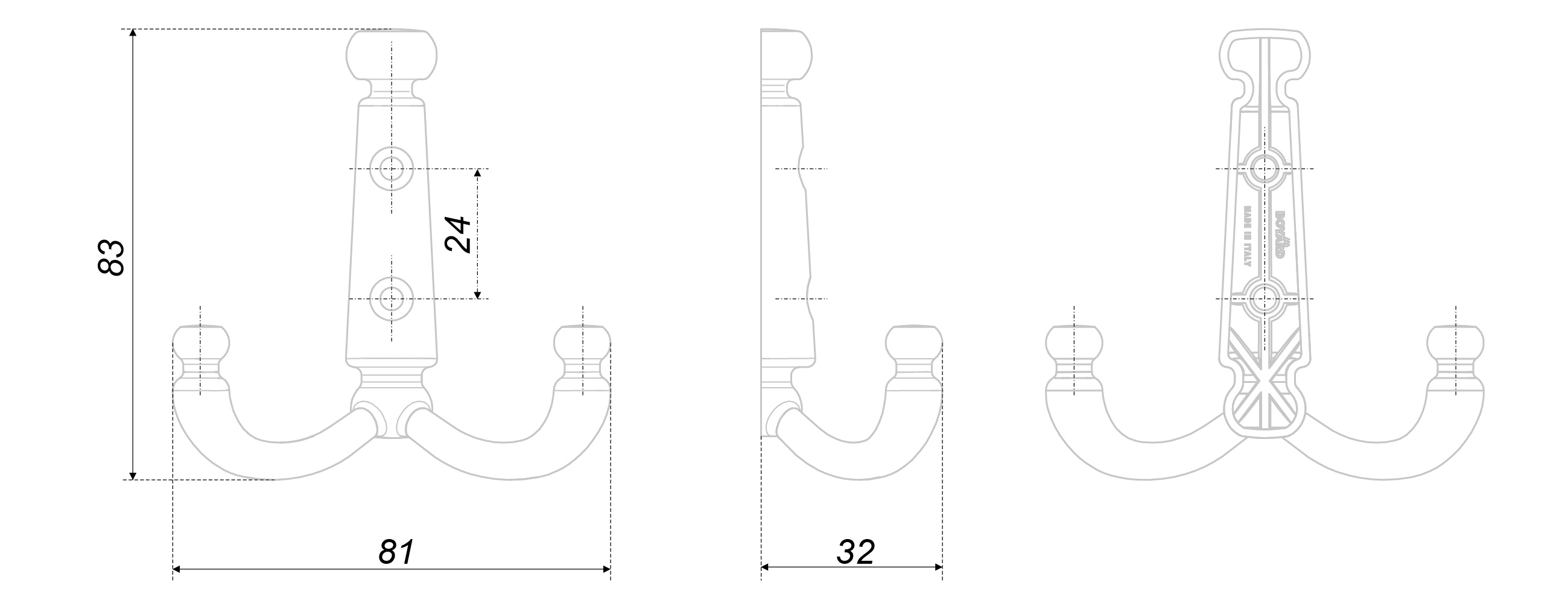 Двухрожковый крючок DOLCE К250 — миниатюрная вариация более крупной модели К350. Крючок К250, благодаря небольшой форме, может быть интегрирован в компактные мебельные гарнитуры или составить пару трёхрожковому К350. Лаконичный дизайн позволяет модели сочетаться с разнообразными классическими ручками соответствующих оттенков.