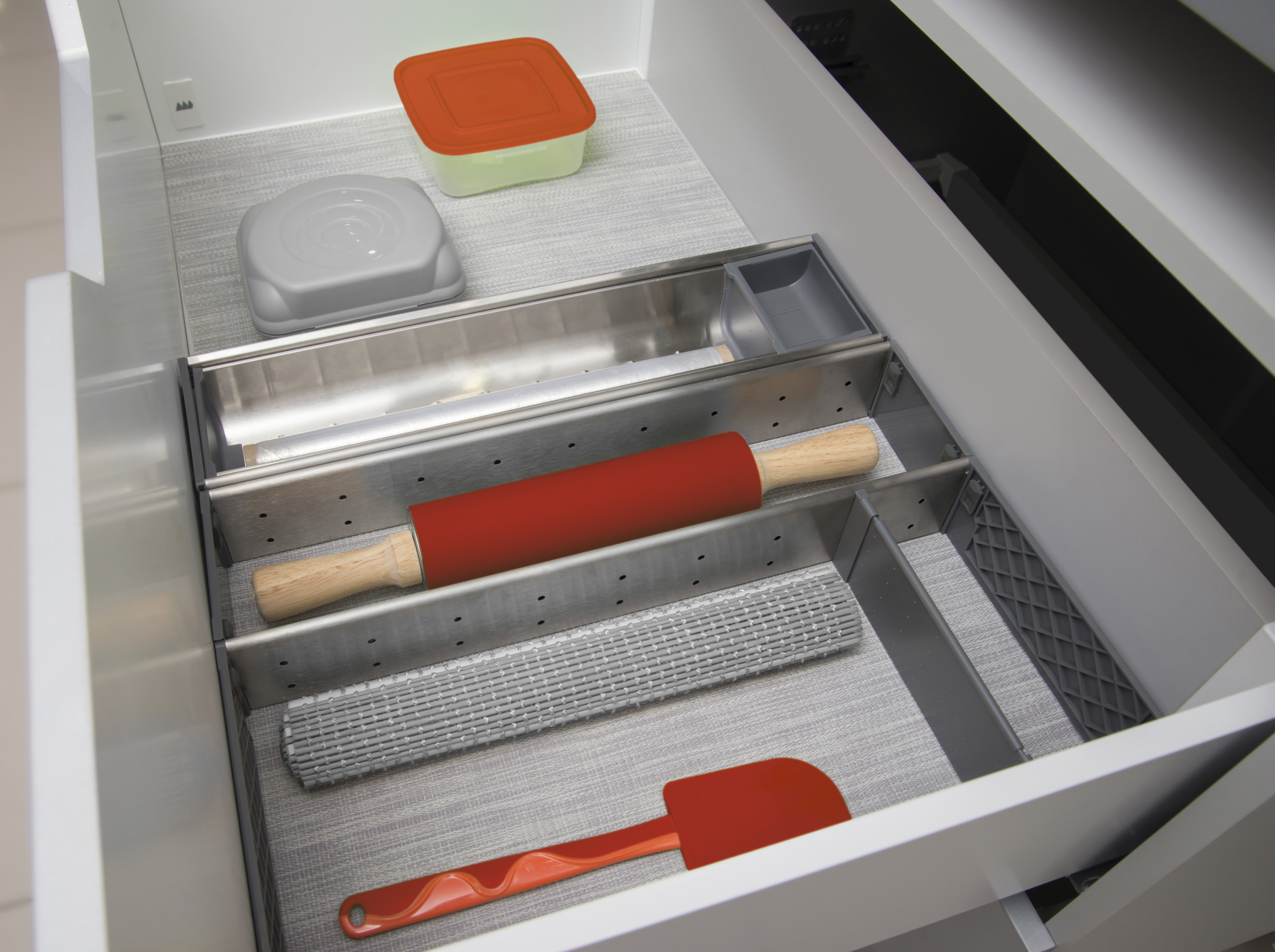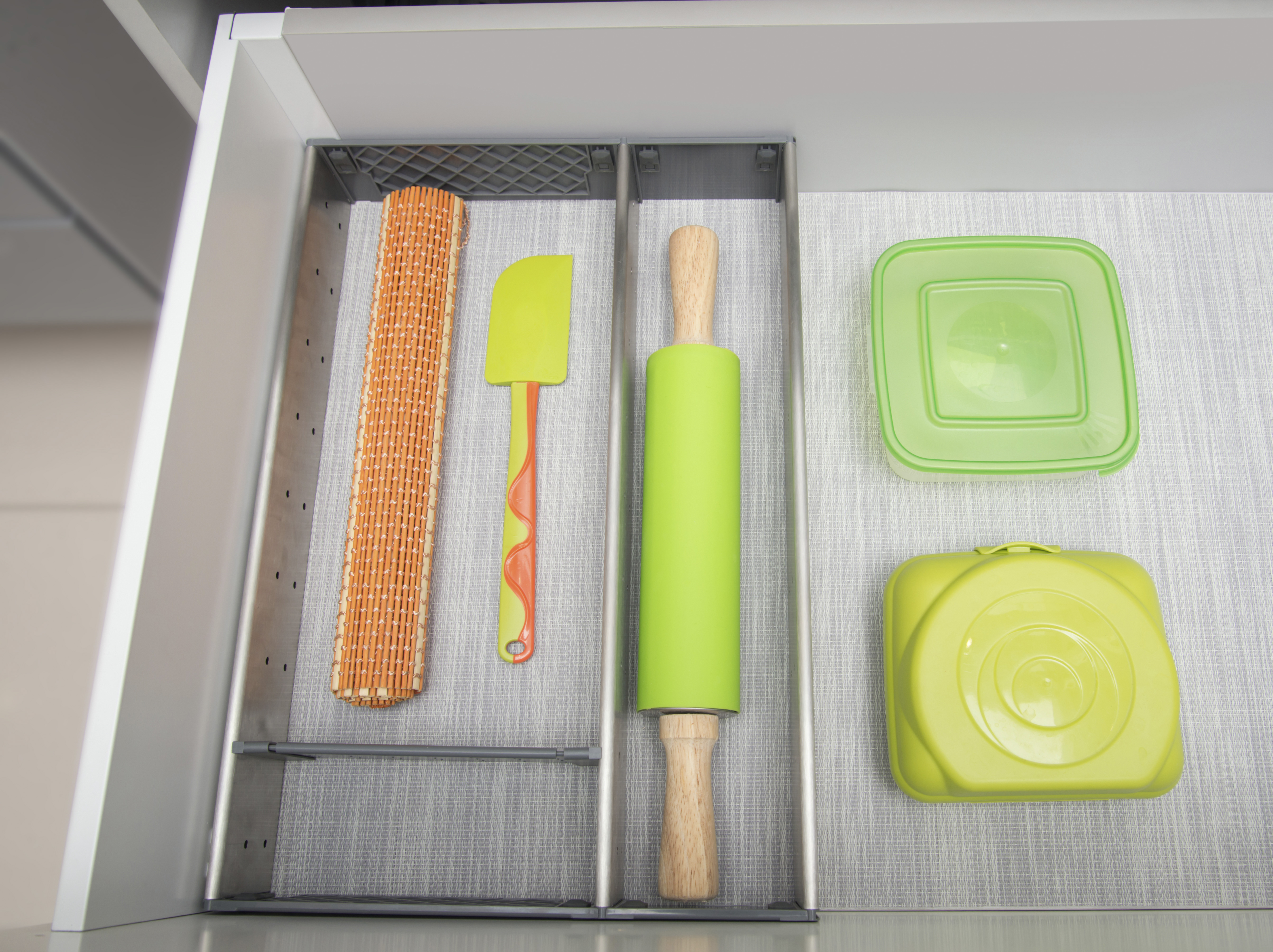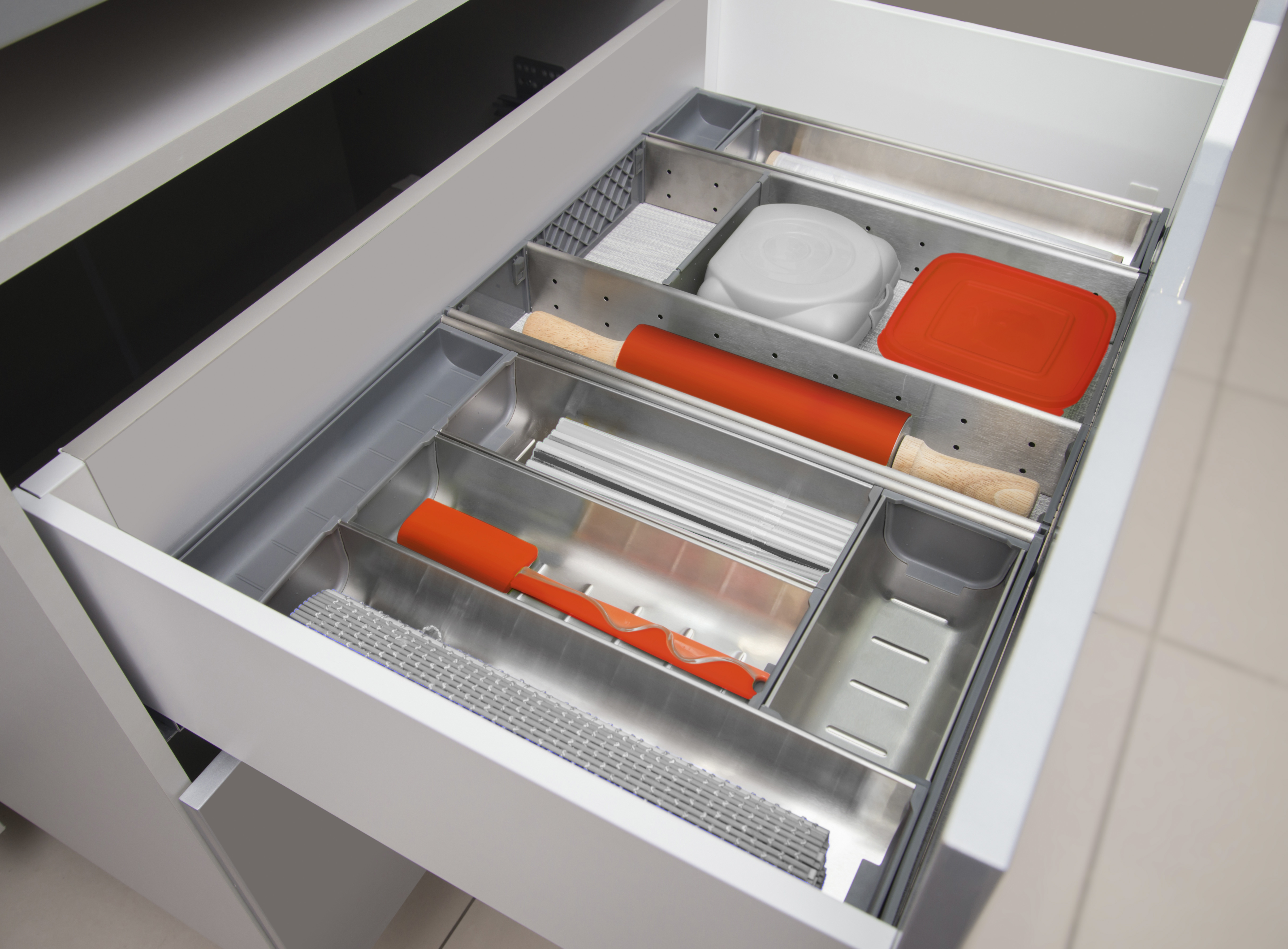 Удобные поддоны-делители из нержавеющей стали для организации внутреннего пространства выдвижных ящиков. Поддоны состоят из нескольких ячеек прямоугольной формы разной ширины. Конфигурация поддонов позволяет обеспечить эргономичное хранение разнообразных предметов: габаритных кухонных принадлежностей (половников, лопаток, пресса для чеснока, закаточной машинки для банок и пр.), инструментов. Поддоны РС06 могут быть дополнением домашней и промышленной мебели, могут размещаться в ящиках как самостоятельно, так и в комплекте с другими поддонами, например с РС04 и РС05. Комбинации из поддонов РС04, РС05, РС06 будут особенно актуальны для широких мебельных модулей.