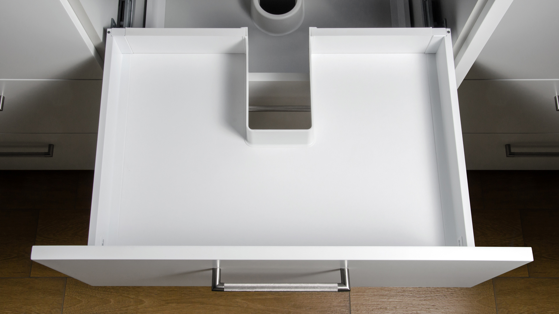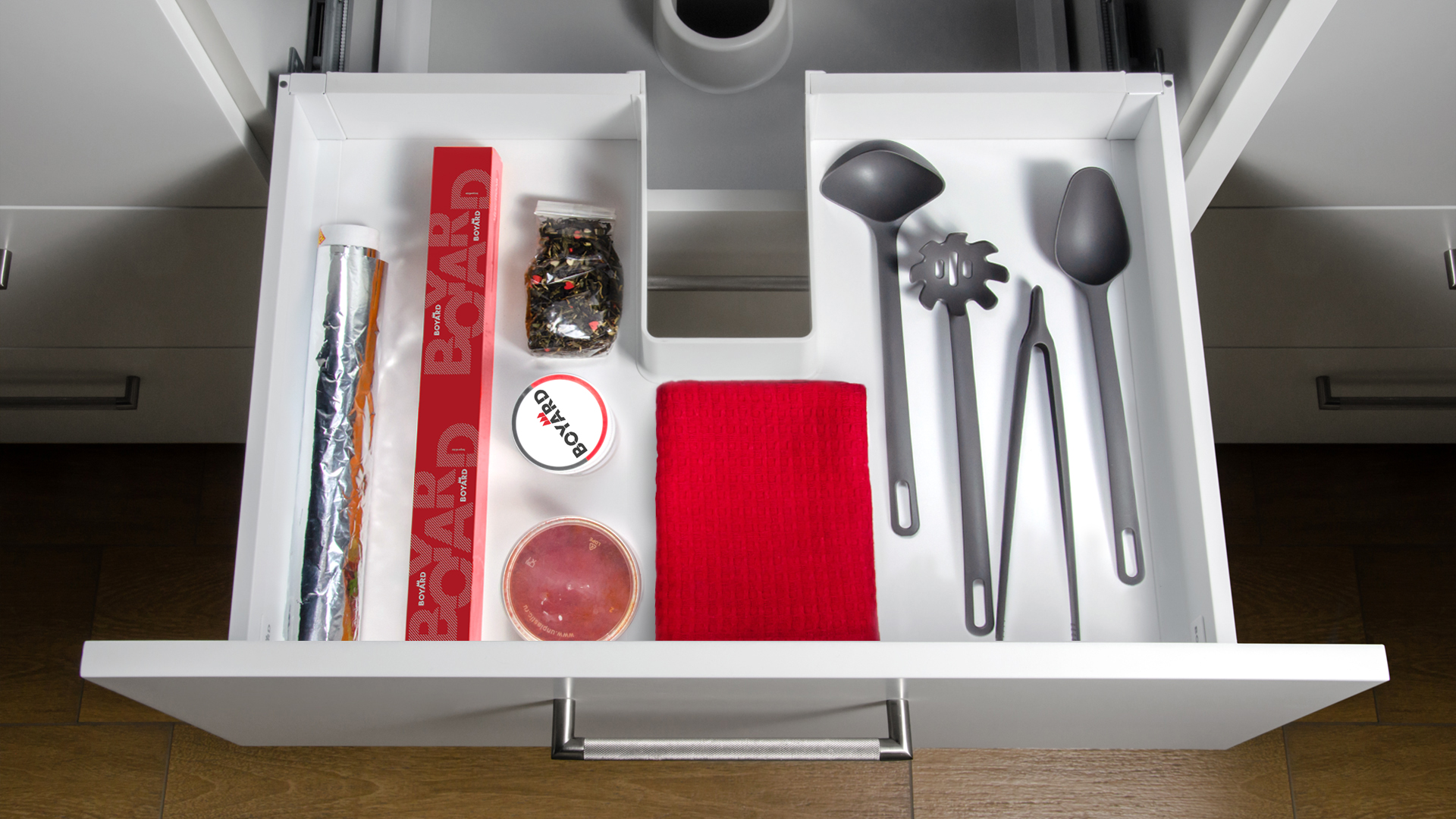 Держатель не ограничивает конструкцию мебельного ящика и не требует расположения строго по центру. Тонкая форма стенок изделия позволит максимально практично использовать внутреннее пространство ящика для хранения кухонных принадлежностей.