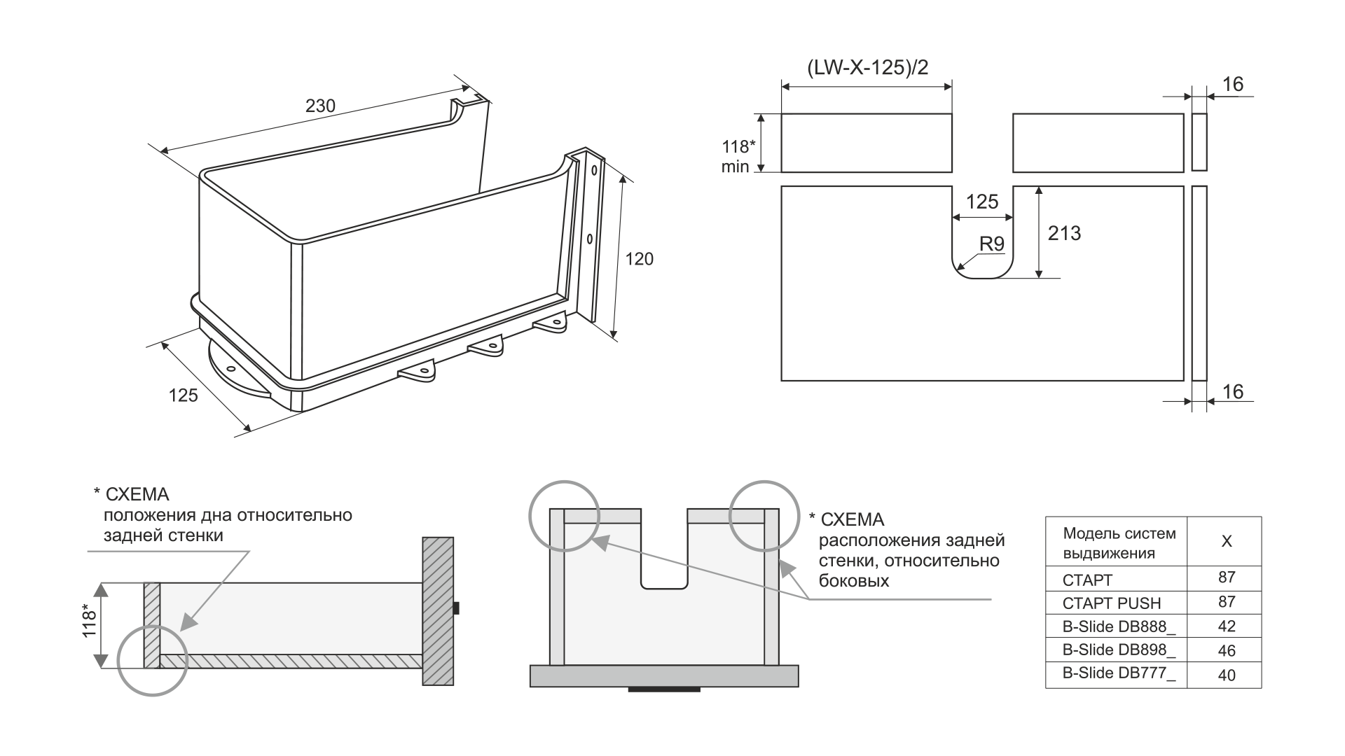 Конструкция изделия совместима с системами выдвижения СТАРТ SOFT и СТАРТ PUSH с прямыми боковинами средней высоты, а также может быть использована в мебели на направляющих других моделей, например, линейки B-SLIDE.