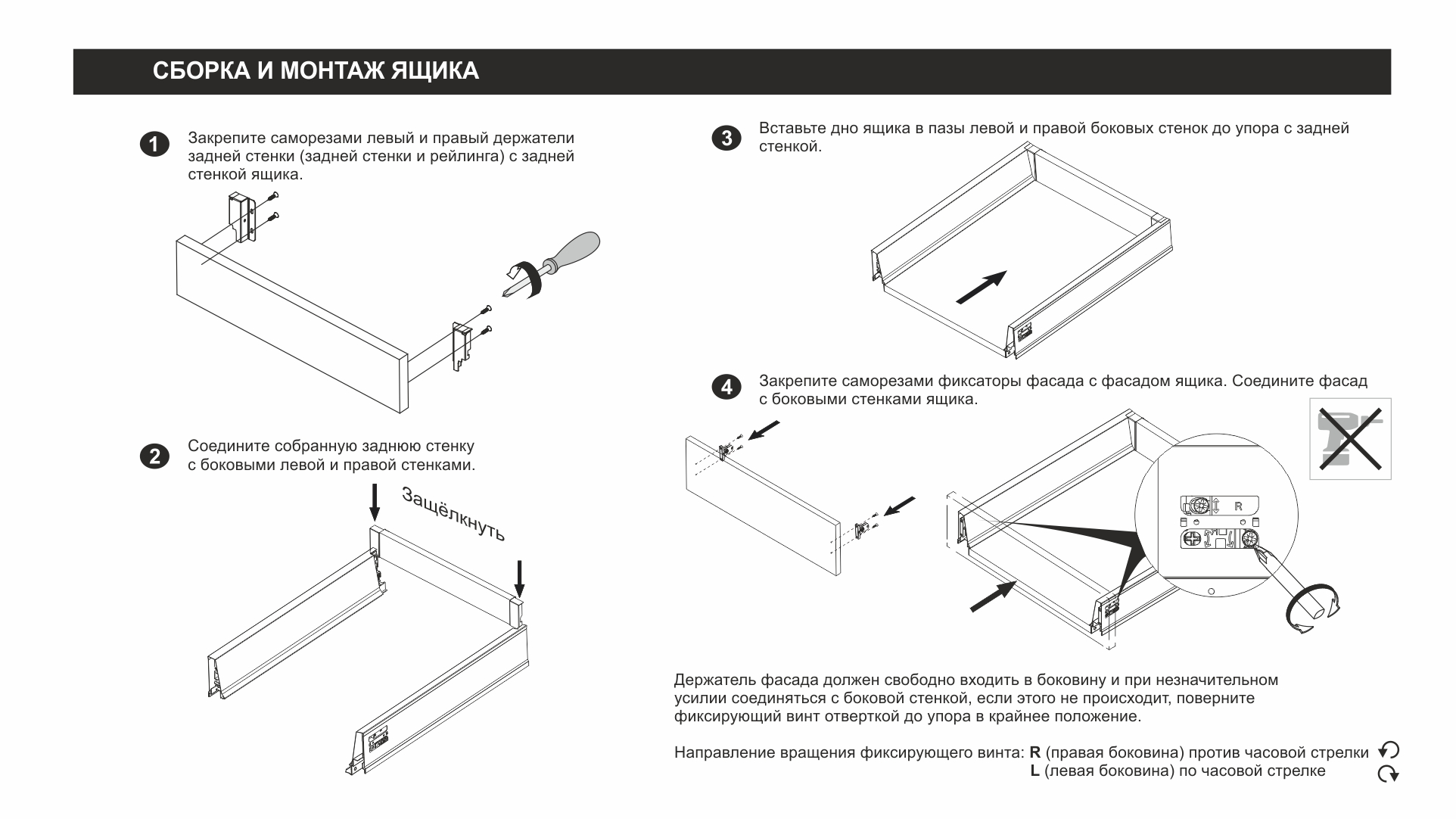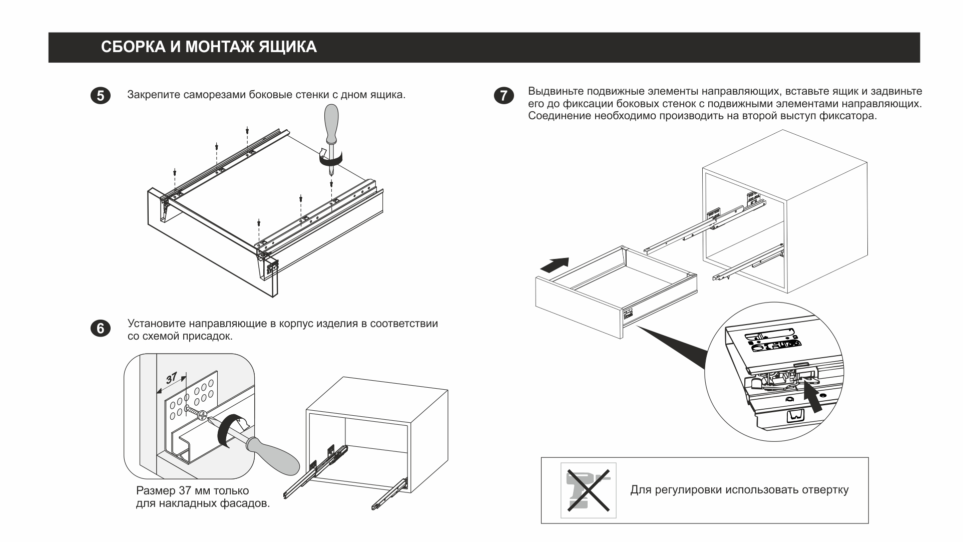 Для сборки выдвижного мебельного ящика на базе СТАРТ PUSH SB29 необходимо самостоятельно изготовить фасад, заднюю стенку и дно ящика.