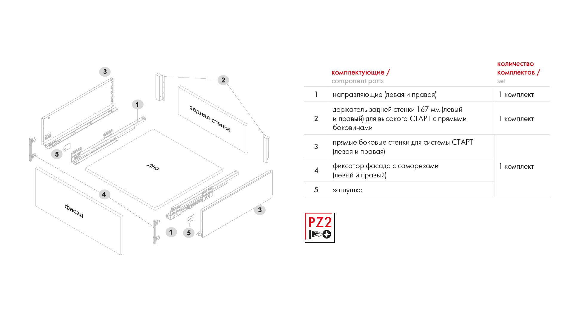 СТАРТ SOFT SB20 — комплект систем выдвижения для сборки высокого выдвижного мебельного ящика с прямыми боковинами высотой 167 мм для минимальной высоты проёма 198 мм.