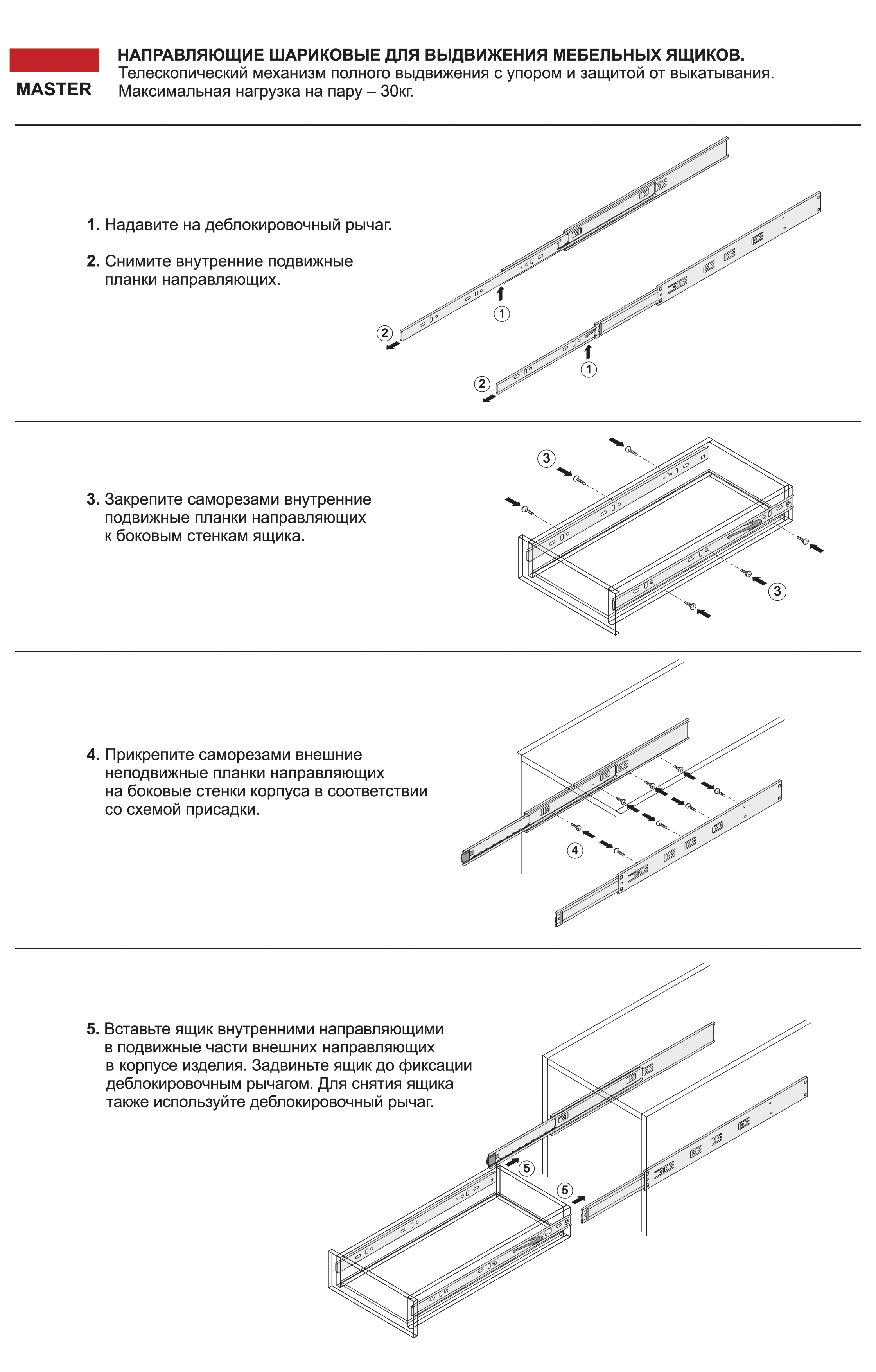 Master DB4504 обладает современными характеристиками и обеспечивает стабильную работу ящиков и плавный, равномерный ход, сравнимый по комфорту с движением современных систем выдвижения. Модель надежна и долговечна – она обладает оптимальной грузоподъемностью 30 кг и гарантирует бесперебойную работу направляющей на протяжении более 50 000 циклов открывания/закрывания.