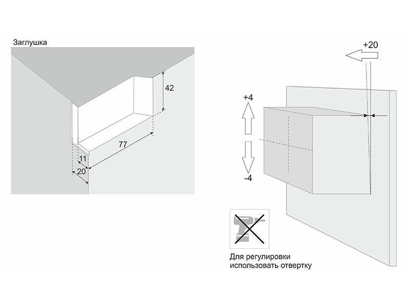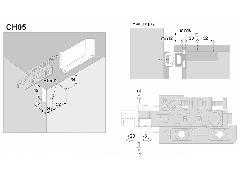 СН05 — навес с металлическим корпусом для верхних баз мебели. Модель устанавливается на боковой стенке внутри мебельного изделия и фиксируется крючком на ответной планке, закреплённой к стене. Ответная планка СНН01 продаётся отдельно. Пара навесов CH05 выдерживает внушительную нагрузку в 95 кг и позволяет отрегулировать модуль по вертикали +/- 4мм и по горизонтали от плоскости стены +20 мм. Заглушки, футорки и евровинты поставляются в комплекте.