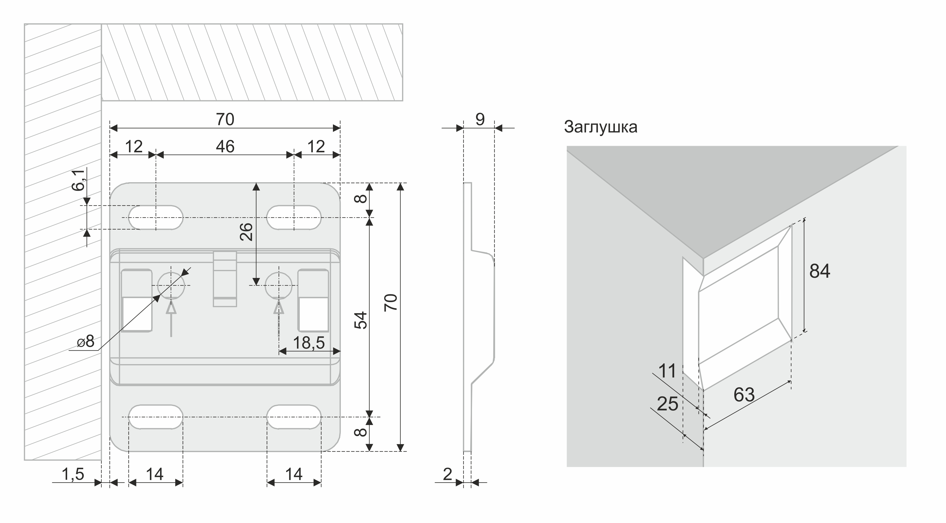 Навес TITAN позволяет отрегулировать положение мебельного модуля по вертикали +/- 6 мм и по горизонтали от плоскости стены +19 мм. После монтажа корпус навеса и отверстие в задней стенке закрываются заглушками.