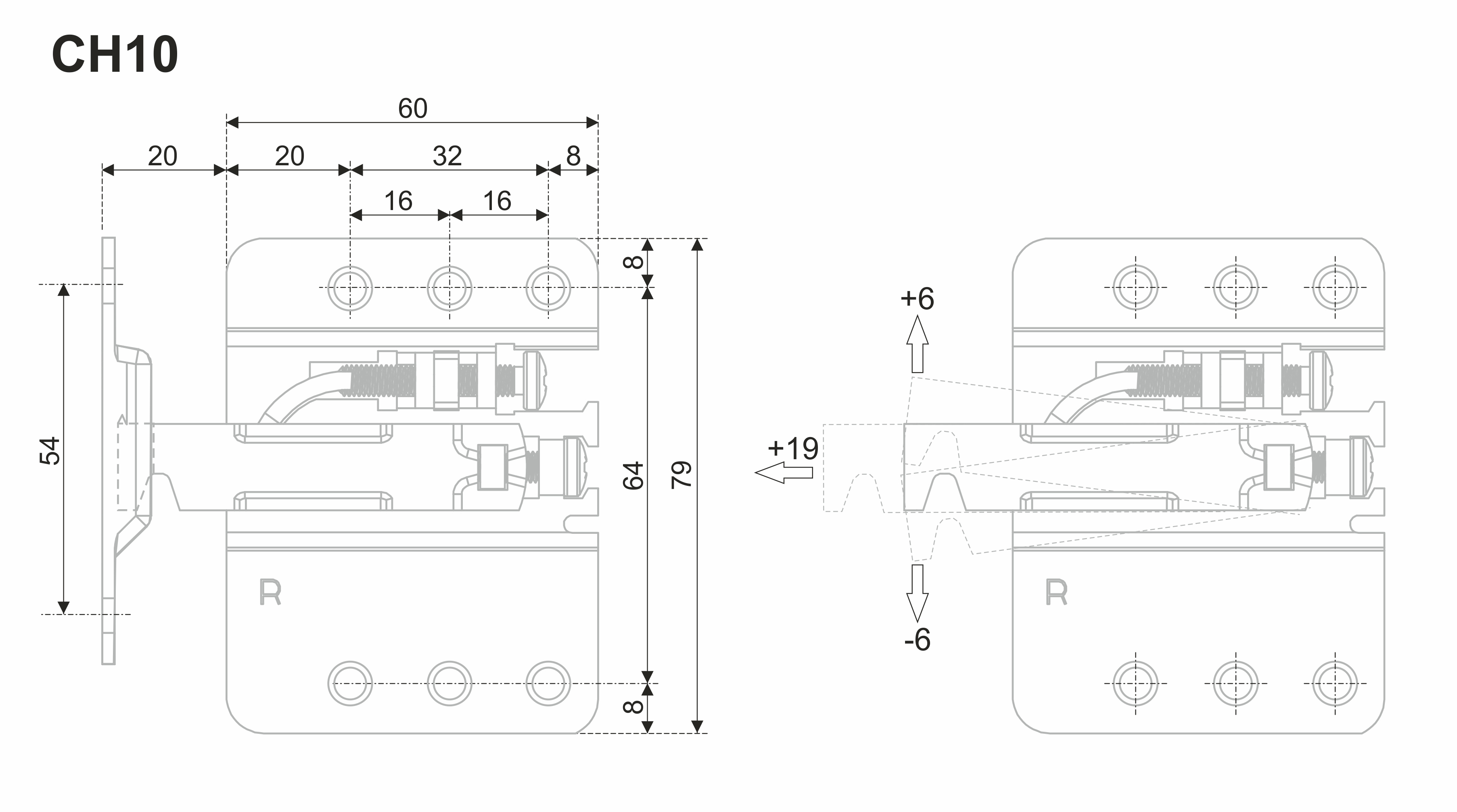 Модель допускает два вида монтажа — вкручивание в предустановленную футорку (12 футорок идут в комплекте) или в пласть. Оба вида монтажа одинаково надёжные и выбираются исходя из предпочтений мебельщиков.