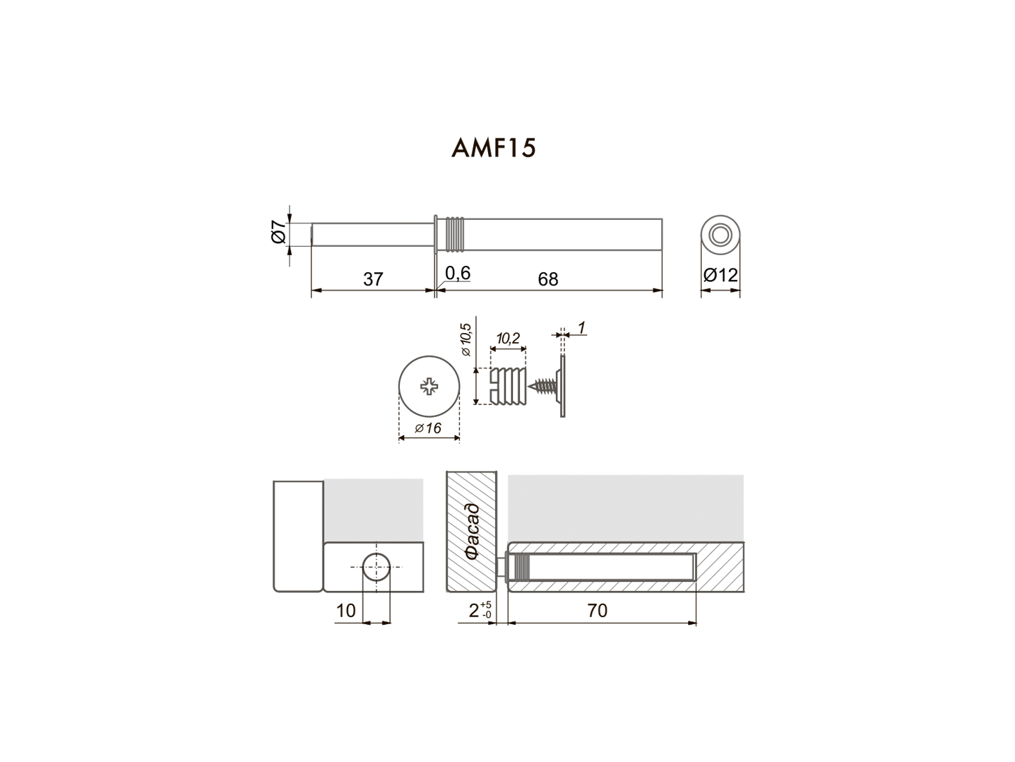 AMF15 – магнитный толкатель для врезного и накладного монтажа для установки на распашные фасады, фасады с открыванием вверх и фасады с открыванием вниз в рамках создания мебели с открытием от нажатия.