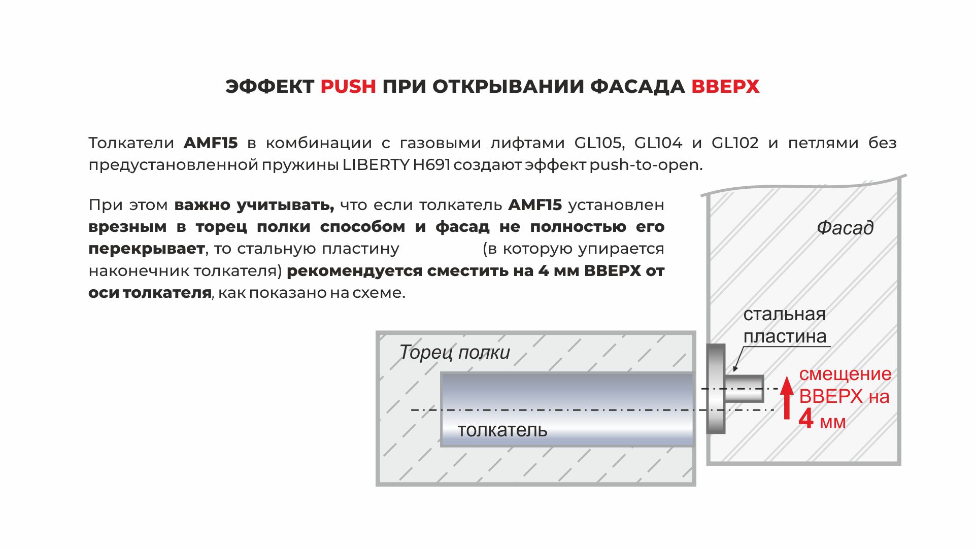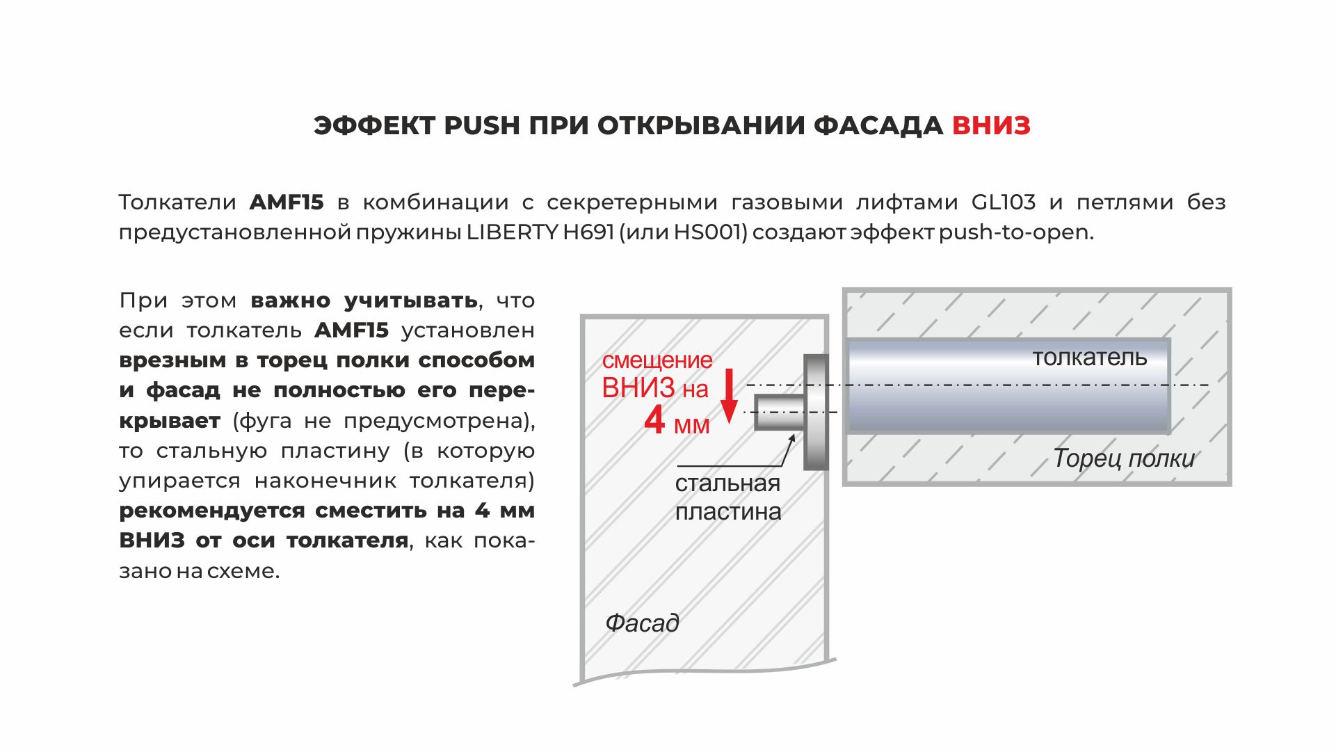 Сильная пружина толкателя позволяет выталкивать даже тяжелые и крупные фасады минимум на 37 мм.