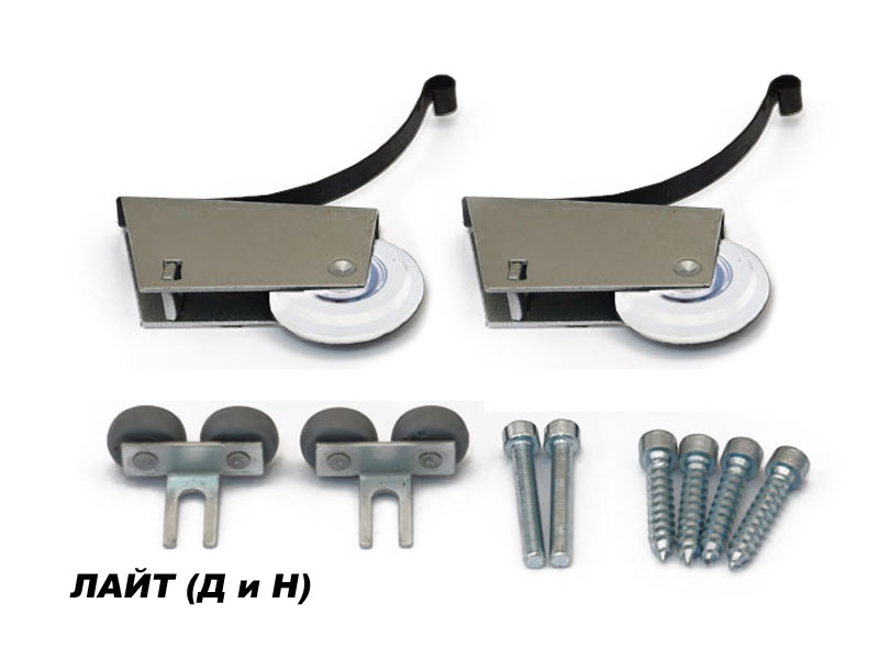 В комплект входит: верхний ролик - 2 шт.; нижний ролик - 2 шт., винт регулировки нижнего ролика - 2 шт.; саморез 6х30 для сборки рамки дверей - 4 шт.